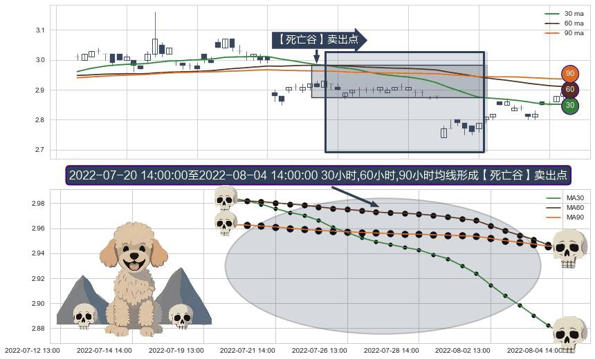 ⚀ 2022-07-21 13:00:00-小时至2022-08-04 14:00:00-小时显现 30小时-60小时-90小时均线 【死亡谷】卖出点 看空信号,后市看跌,卖出