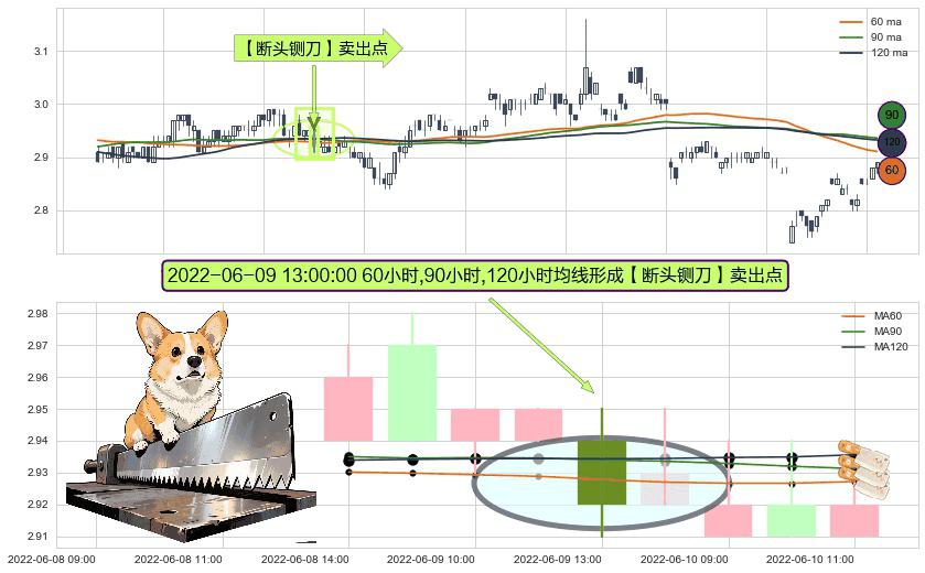 ⚀ 2022-06-09 13:00:00小时显现 60小时-90小时-120小时均线 【断头铡刀】卖出点 看空信号,后市看跌,卖出
