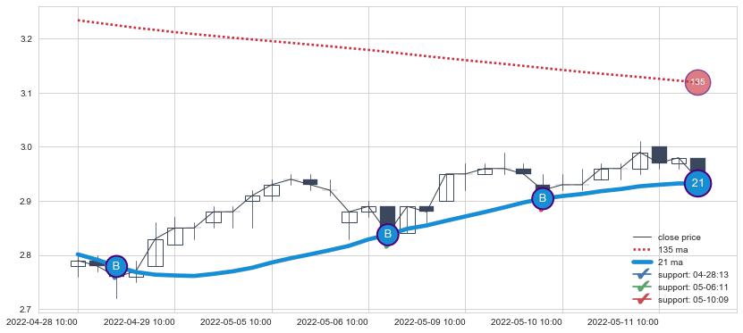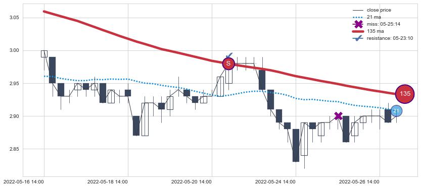 ⚁ MA3和MA8走势平行,且始终保持在短距离内,MA21始终在短中期均线上方,与短中期均线保持一定的距离,微微下行