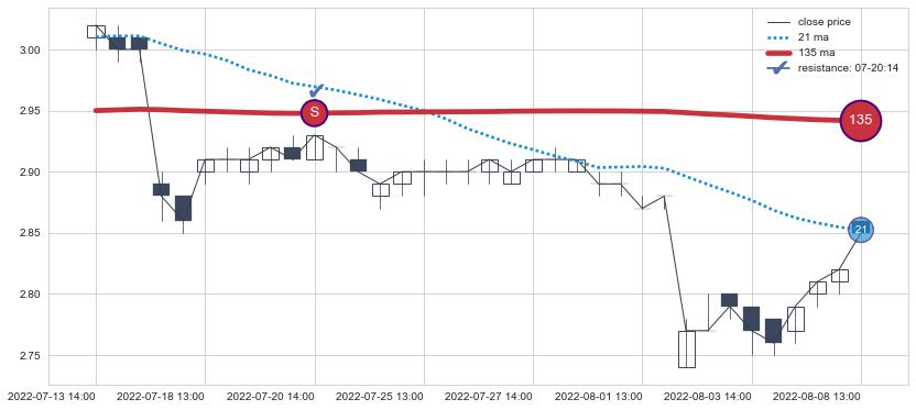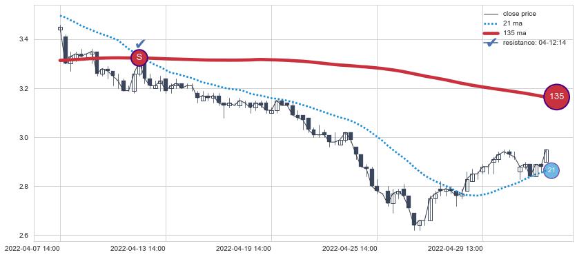 ⚂ 2022-06-21 13:00:00-小时均线向上突破,2022-07-15 13:00:00-小时重新下穿均线破位,均线阻力再次生效