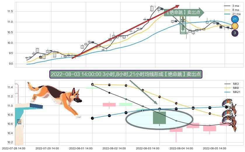 ⚀ 2022-08-03 14:00:00小时显现 3小时-8小时-21小时均线 【绝命跳】卖出点 看空信号,后市看跌,卖出