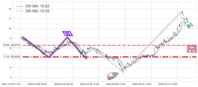 ♘ 支撑价格位7.10,可信任强度78.44%,距离最后交易2022-08-12 14:00形成的收盘价格10.66相差 -33.43%