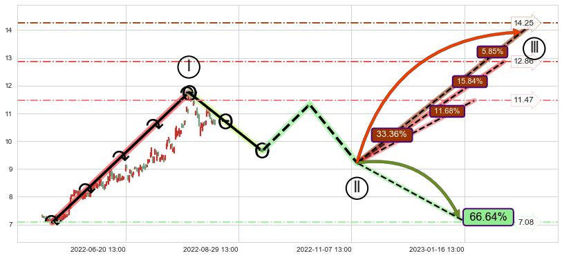 从2022-06-14 11:00至2022-06-16 13:00,共包含12个小时,阶段股价上涨3.06%,阶段股价变动位移路程比: 1 : 3