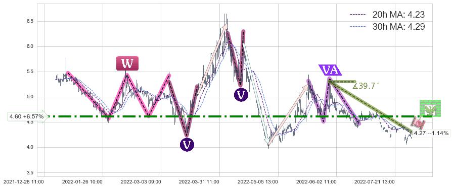 2022-06-29: 第一阻力位4.60强力阻拦了上升趋势,成功阻止了价格的继续上涨。