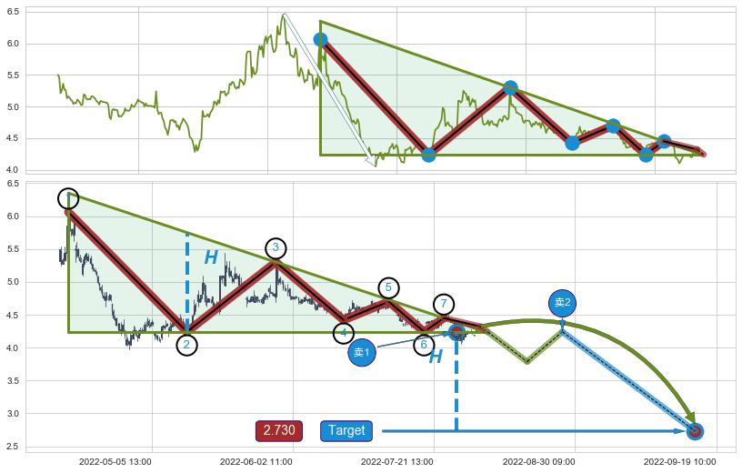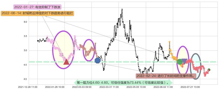 2022-06-14: 时域附近第一阻力位4.60持续的对下跌趋势进行阻拦,有效地放缓了下跌的速度。