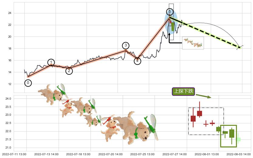从2022-07-28 14:00至2022-08-12 14:00,共包含23个小时,阶段股价下跌-4.86%,阶段股价变动位移路程比: 1 : 8