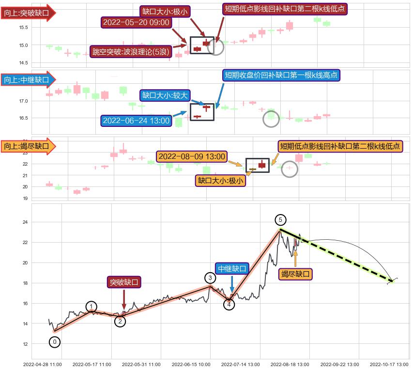 ➢ 突破缺口形成后,后续k已经超过14根,跳空突破波浪理论(5浪)关键点后, 出现【完全回踩】迹象,短期收盘价回补缺口第一根k线低点