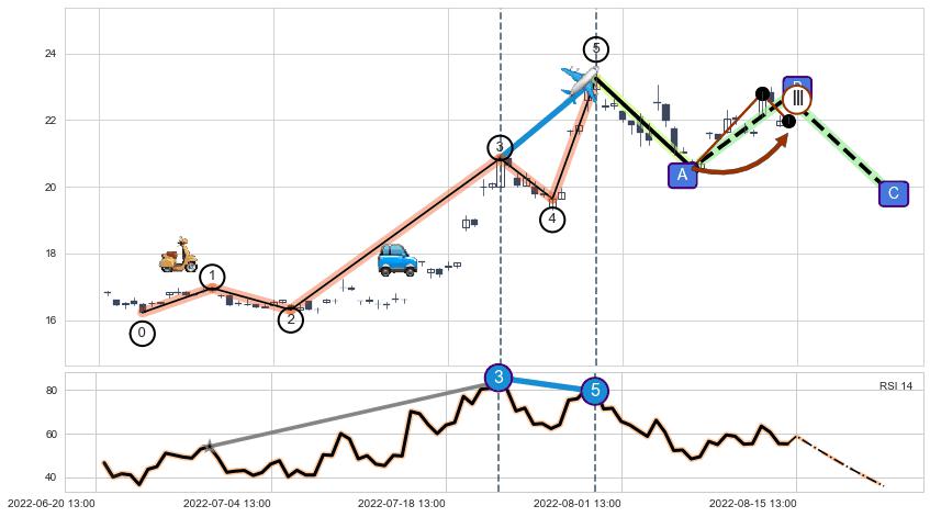 ➣ 突破缺口形成后,后续k已经超过14根,跳空突破波浪理论(5浪)关键点后, 出现【轻微回踩】迹象,短期高点影线回补缺口第二根k线高点
