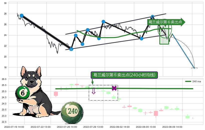 | 7 🅚:葛兰威尔第⑥卖出点 ➕ 🌊:波浪理论下跌5浪延续:猜想C点强阻力小反弹终止,猜想保持下跌5浪方向下行(均值回复后大周期继续趋势跟踪) ☞ 看空信号 ⇥ 【均线】交织【图形】⇥ 综合量化分数: 28 | > |
