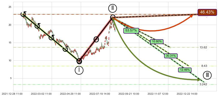 ➣ 调整浪已超过预测的c点位置,后续大趋势循环浪继续下跌概率53.57%,谨慎做多