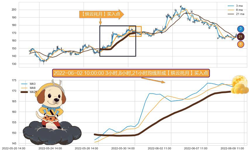 形态多维评估: ⚀ 2022-05-26 13:00:00小时-2022-06-09 09:00:00小时显现 3小时-8小时-21小时均线 【烘云托月】买入点 看多信号,后市看涨,买入