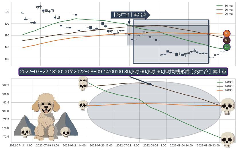 形态多维评估: ⚀ 2022-07-22 14:00:00-小时至2022-08-09 14:00:00-小时显现 30小时-60小时-90小时均线 【死亡谷】卖出点 看空信号,后市看跌,卖出