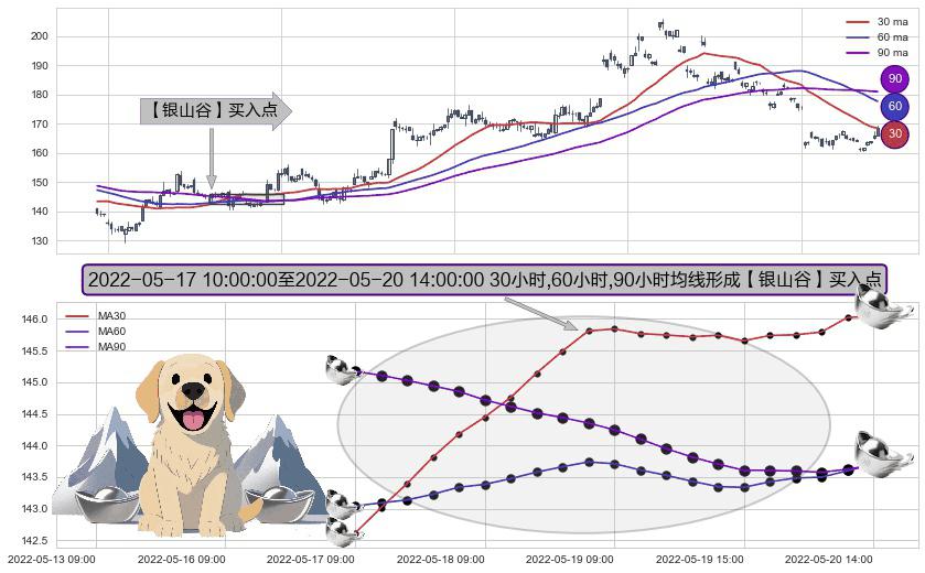 形态多维评估: ⚀ 2022-05-17 11:00:00-小时至2022-05-20 14:00:00-小时显现 30小时-60小时-90小时均线 【银山谷】买入点 看多信号,后市看涨,买入