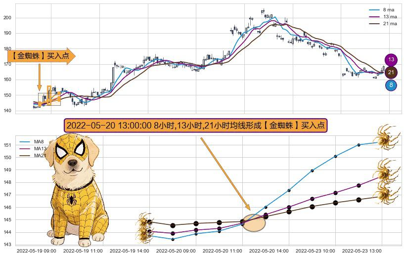形态多维评估: ⚀ 2022-05-20 13:00:00小时显现 8小时-13小时-21小时均线 【金蜘蛛】买入点 看多信号,后市看涨,买入