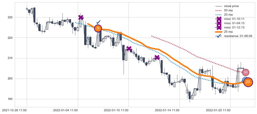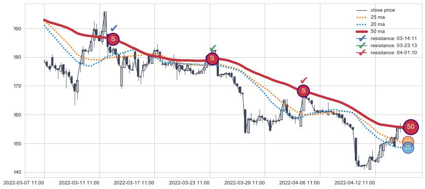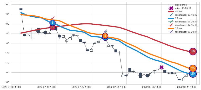 下跌趋势07-08 14:00-08-11 14:00,均线25, 50, 20确认关键阻力2处