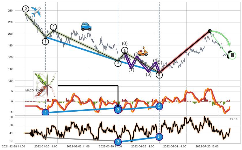➣ 第一, 三, 五浪下跌动能逐渐【衰弱变小】,趋势呈现不稳迹象