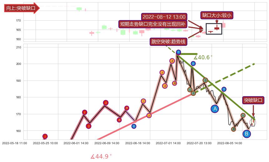 从2022-06-30 13:00至2022-08-12 13:00,共包含63个小时,阶段股价下跌-19.80%,阶段股价变动位移路程比: 1 : 3,下跌趋势角度: 40.6,2022-07-11 13:00向↘︎形成缺口,跳空下跌-6.65%˚