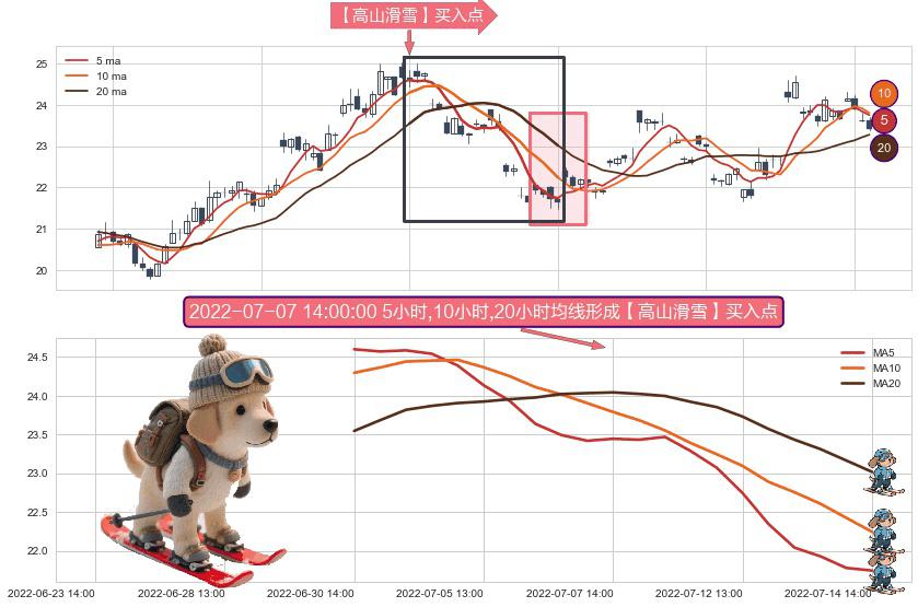 ⚀ 2022-06-30 14:00:00小时-2022-07-14 14:00:00小时显现 5小时-10小时-20小时均线 【高山滑雪】买入点 看多信号,后市看涨,买入