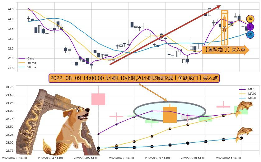 ⚀ 2022-08-09 14:00:00小时显现 5小时-10小时-20小时均线 【鱼跃龙门】买入点 看多信号,后市看涨,买入