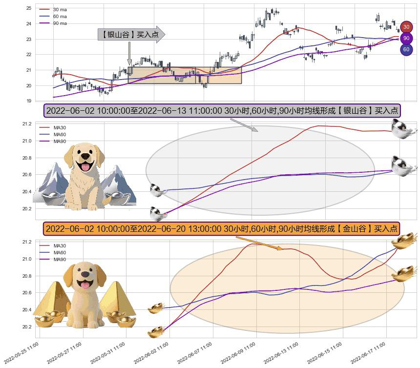⚃ 2022-06-02 11:00:00-小时至2022-06-20 13:00:00-小时显现 30小时-60小时-90小时均线 【金山谷】买入点 其再次确认了买入信号,可靠性更强,买入