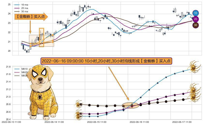 ⚀ 2022-06-16 09:00:00小时显现 10小时-20小时-30小时均线 【金蜘蛛】买入点 看多信号,后市看涨,买入