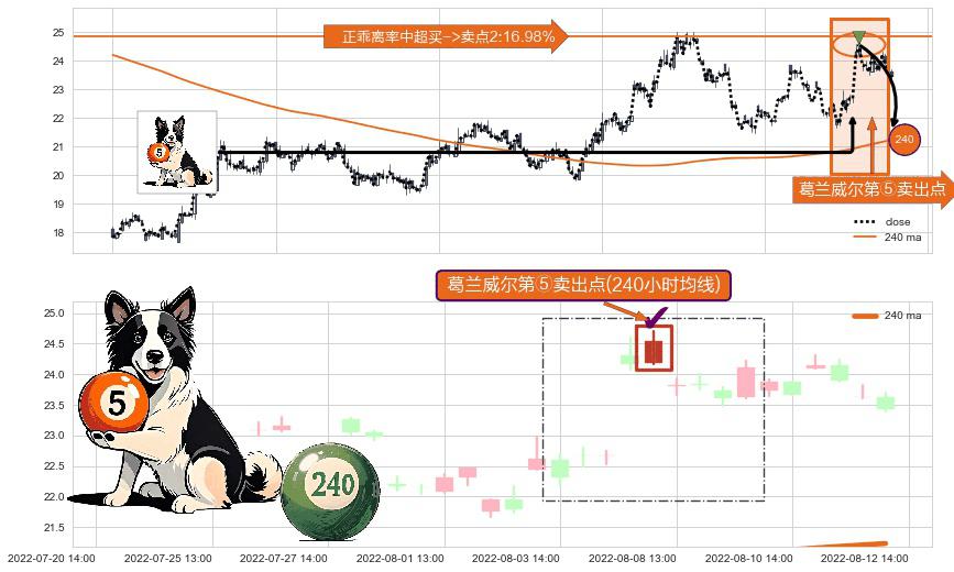 ⚀ 2022-08-05 14:00:00-小时显现 葛兰威尔均线 240小时均线 第⑤卖出点 上升趋势均值回复的短线回落信号,后市看跌,卖出信号