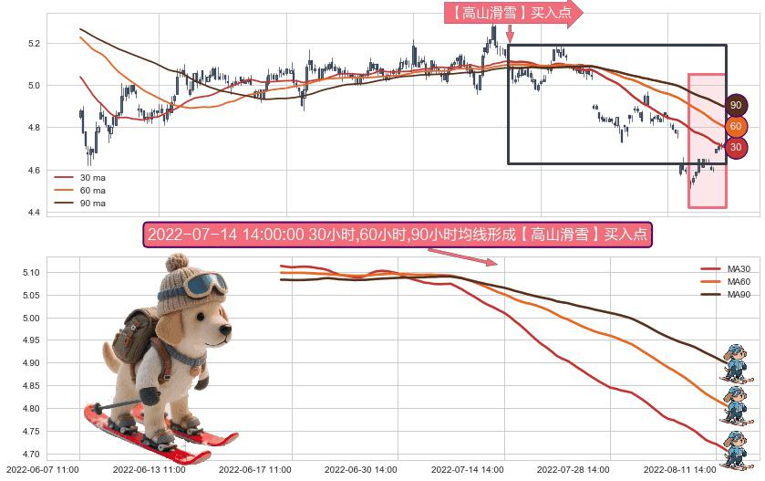 ⚀ 2022-06-17 09:00:00小时-2022-08-12 14:00:00小时显现 30小时-60小时-90小时均线 【高山滑雪】买入点 看多信号,后市看涨,买入