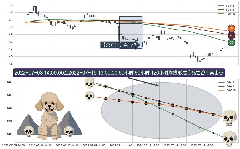 ⚀ 2022-07-11 13:00:00-小时至2022-07-15 13:00:00-小时显现 60小时-90小时-120小时均线 【死亡谷】卖出点 看空信号,后市看跌,卖出