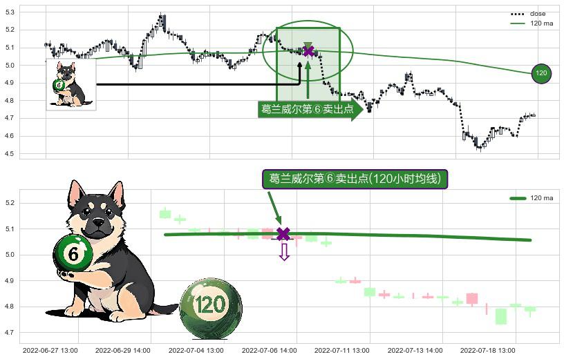 ⚀ 2022-07-06 13:00:00-小时显现 葛兰威尔均线 120小时均线 第⑥卖出点 走势反转见顶信号,后市看跌,卖出信号