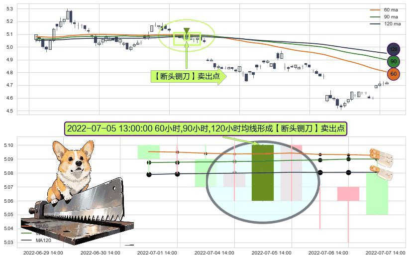 ⚀ 2022-07-05 13:00:00小时显现 60小时-90小时-120小时均线 【断头铡刀】卖出点 看空信号,后市看跌,卖出