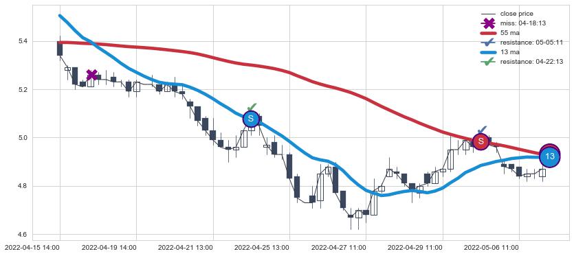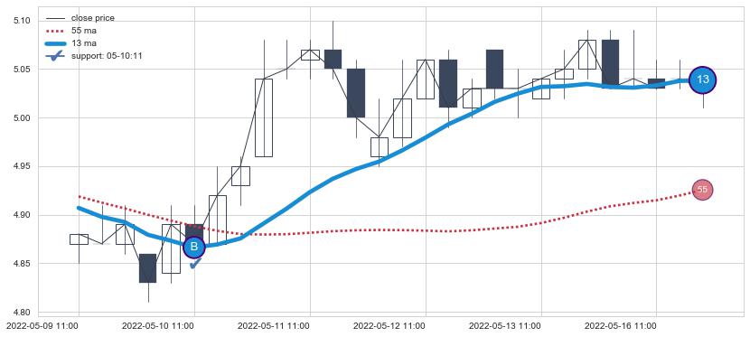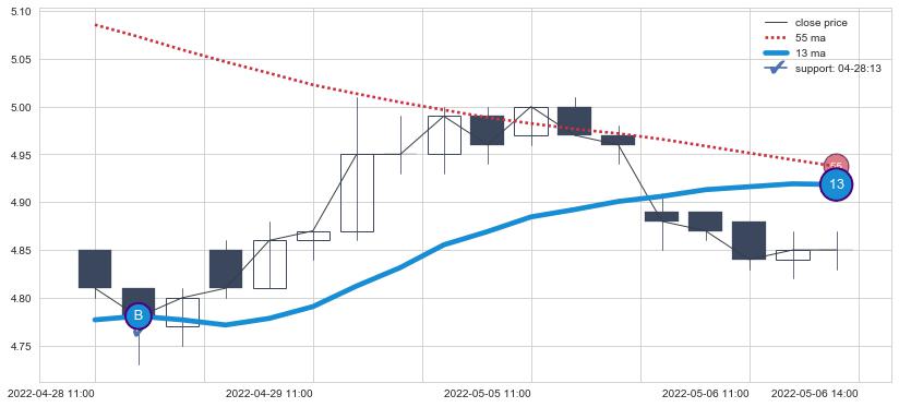 ⚃ 在破位点附近ma走势明显平稳迹象,稍后的走势中ma下垂迹象也出现,信号【可信度中等偏上】