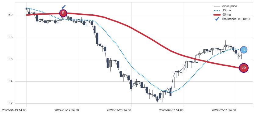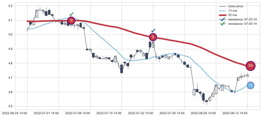 ⚂ 2022-06-07 11:00:00-小时均线向上突破,2022-07-08 13:00:00-小时重新下穿均线破位,均线阻力再次生效