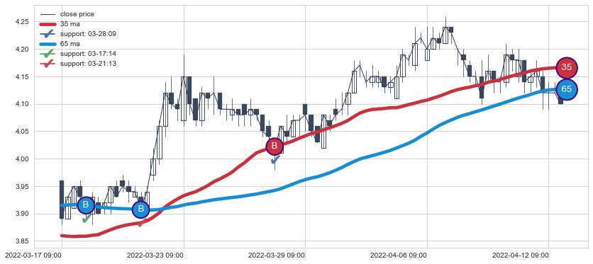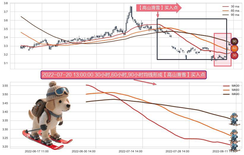 ⚀ 2022-06-28 14:00:00小时-2022-08-10 14:00:00小时显现 30小时-60小时-90小时均线 【高山滑雪】买入点 看多信号,后市看涨,买入