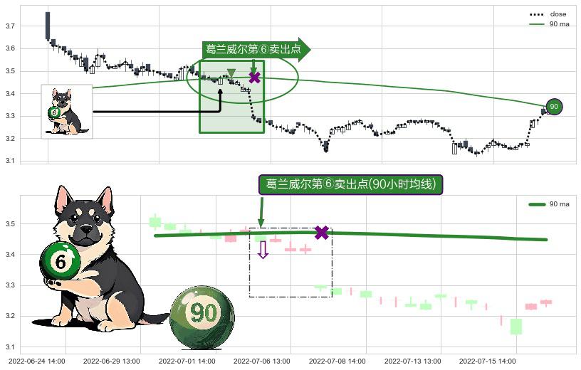 ⚀ 2022-07-05 13:00:00-小时显现 葛兰威尔均线 90小时均线 第⑥卖出点 走势反转见顶信号,后市看跌,卖出信号