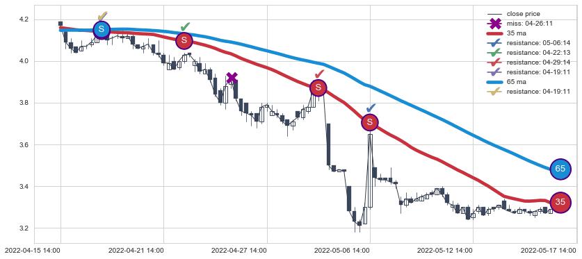⚄ 价格在均线遇到阻力后再次向下回落了【极短】距离, 第⑦卖出点 阻力效果【等待验证】