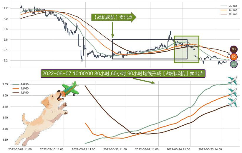 ⚀ 2022-05-19 14:00:00小时-2022-06-28 14:00:00小时显现 30小时-60小时-90小时均线 【战机起航】卖出点 看空信号,后市看跌,卖出