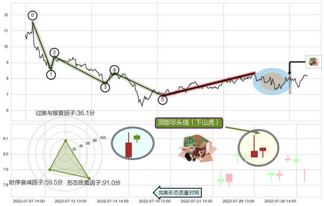 ➢ 🕰 价格走势在2022-07-26 13:00:00至2022-07-26 14:00:00期间形成顶部尽头线(下山虎),残存影响值:-4.83