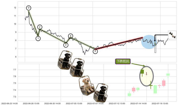 ➢ 🕰 价格走势在2022-07-14 13:00:00至2022-07-15 13:00:00期间形成下跌抵抗,残存影响值:-1.38