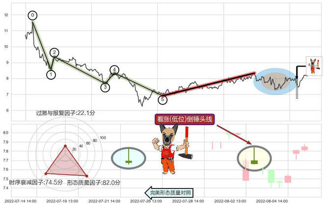 ➢ 🕰 价格走势在2022-08-02 14:00:00至2022-08-02 14:00:00期间形成看涨(低位)倒锤头线,残存影响值:4.44
