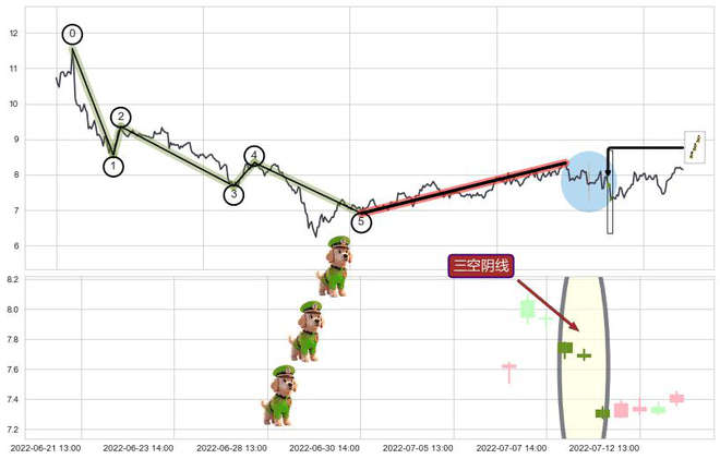 ➢ 🕰 价格走势在2022-07-08 13:00:00至2022-07-11 13:00:00期间形成三空阴线,残存影响值:0.90