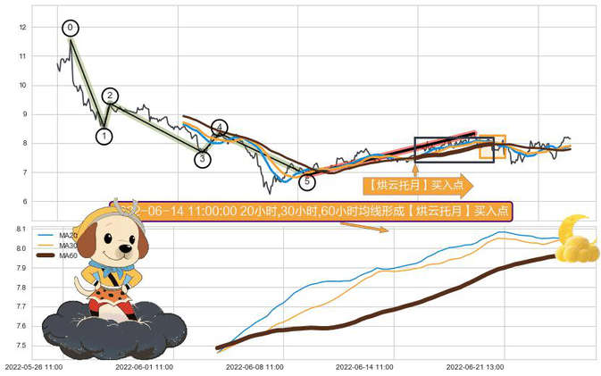 ➣ 🕰 价格走势在2022-06-22 13:00:00至2022-07-06 13:00:00期间形成【烘云托月】买入点,残存影响值:17.41