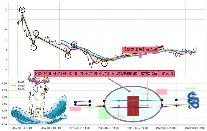 ➣ 🕰 价格走势在2022-06-01 14:00:00至2022-06-02 10:00:00期间形成【蛟龙出海】买入点,残存影响值:1.42