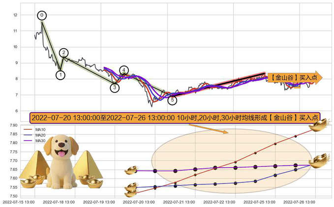 ➣ 🕰 价格走势在2022-07-20 14:00:00至2022-07-26 13:00:00期间形成【金山谷】买入点,残存影响值:8.00