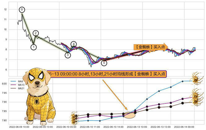 ➣ 🕰 价格走势在2022-06-13 09:00:00至2022-06-13 09:00:00期间形成【金蜘蛛】买入点,残存影响值:7.79