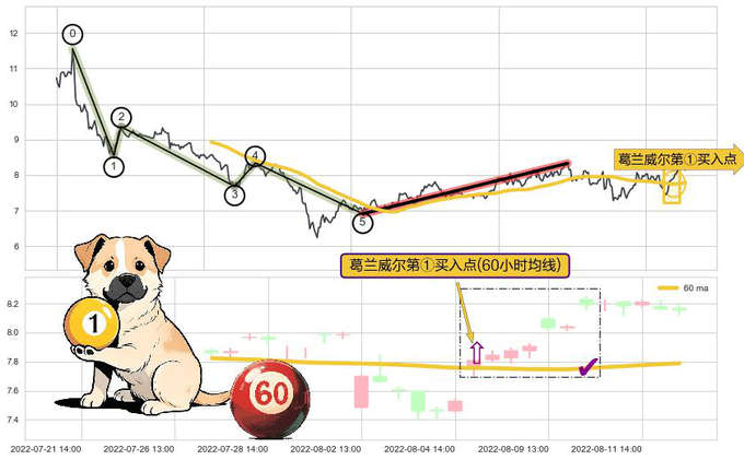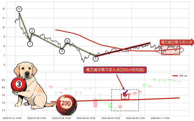 ➣ 🕰 价格走势在2022-08-03 14:00:00至2022-08-10 13:00:00期间形成葛兰威尔第①买入点,残存影响值:10.83