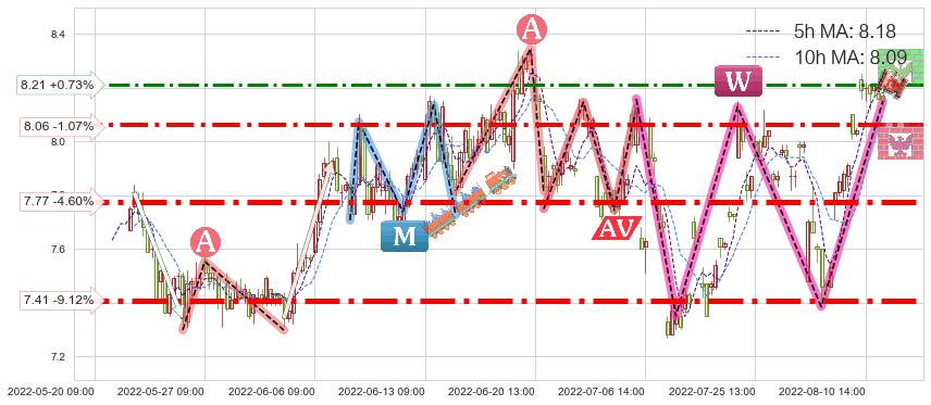 ♘ 支撑价格位7.77,可信任强度87.60%,距离最后交易2022-08-12 14:00形成的收盘价格8.15相差 -4.60%