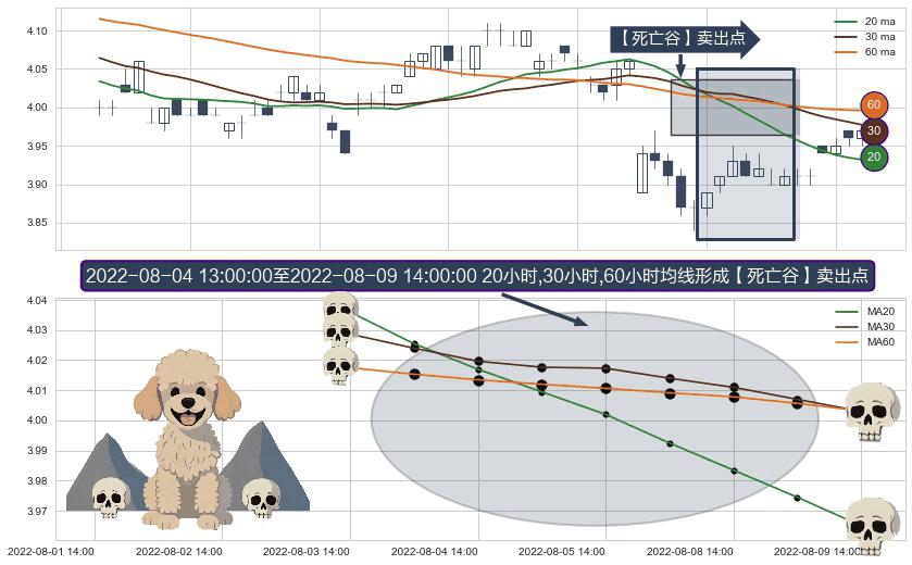 形态多维评估: ⚀ 2022-08-04 14:00:00-小时至2022-08-09 14:00:00-小时显现 20小时-30小时-60小时均线 【死亡谷】卖出点 看空信号,后市看跌,卖出