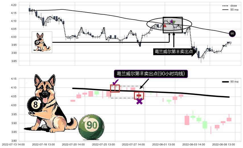 形态多维评估: ⚀ 2022-07-27 13:00:00-小时显现 葛兰威尔均线 90小时均线 第⑧卖出点 下降趋势的中继信号,后市看跌,卖出信号