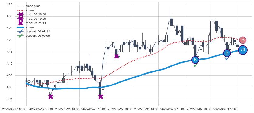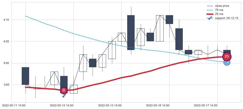 上涨趋势05-17 10:00-06-09 11:00,均线70确认关键支撑2处