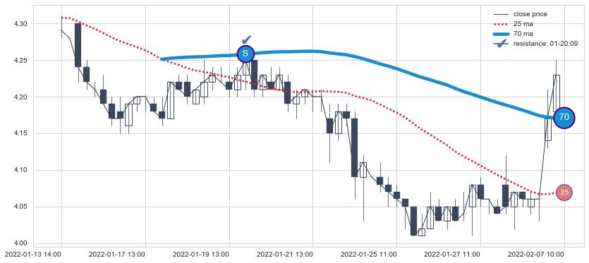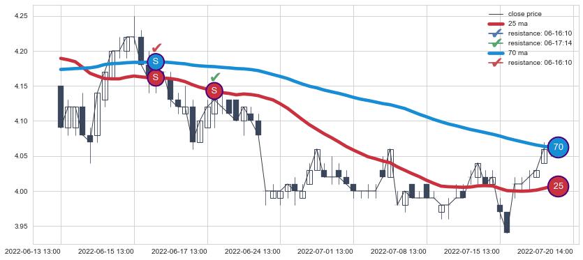 下跌趋势06-13 13:00-07-20 14:00,均线25, 70确认关键阻力2处
